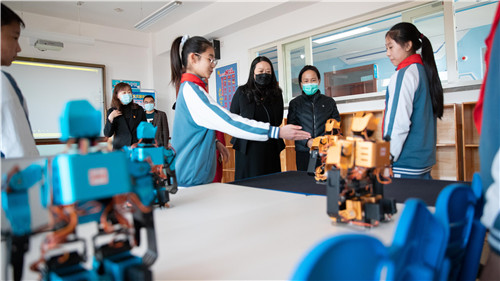一進門,可愛的迎賓機器人小胖熱情的介紹了華西小學(xué)的校園文化,緊接著華西小學(xué)數(shù)字美術(shù)、定格動畫、人形機器人、物流機器人、智能車、3D手繪、3D打印、水中機器人等創(chuàng)客社團的活動令人目不暇接。孩子們自信滿滿,一邊熟練的操作,一邊侃侃而談。學(xué)生們奪金摘銀的獲獎榮譽,老師們對跨學(xué)科教育的深入思考,給到訪的領(lǐng)導(dǎo)們留下了深刻的印象。隨后,各位教研員老師來到信息技術(shù)課堂,走進華西小學(xué)吳靜哲老師執(zhí)教的《體驗人工智能》一課。課后,省教研員趙春芝老師對年輕教師的課堂教學(xué)定位給予了充分的肯定,人機對抗的游戲化設(shè)計不僅激發(fā)學(xué)生的興趣,還促進學(xué)生深度思考人工智能的優(yōu)勢和局限,培養(yǎng)學(xué)生的核心素養(yǎng)。趙老師對華西小學(xué)深度融合信息技術(shù)跨學(xué)科課程建設(shè)給予高度的評價,充分肯定了華西小學(xué)將信息技術(shù)助力五育并舉的創(chuàng)新做法。她鼓勵學(xué)校要挖掘各個學(xué)科教師的個人潛能,使其積極投入到跨學(xué)科教學(xué)活動中去,使華西小學(xué)在深度融合信息技術(shù)進行跨學(xué)科課程建設(shè)方面走在全省前列,幫助學(xué)生們德智體美勞全面發(fā)展。