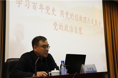 大家聽取了市委黨史學習教育宣講團成員、大連大學馬克思主義學院副教授、碩士生導師白明春所作的《學習百年黨史,用黨的創(chuàng)新理論武裝全黨的政治自覺》專題報告。白明春副教授用了兩個小時的時間,作了一場內(nèi)容豐富、精彩生動、充滿激情的宣講報告。白明春副教授緊緊圍繞深入學習領(lǐng)會總書記關(guān)于黨的歷史重要論述,深刻闡釋了在全黨開展黨史學習教育的重大意義;圍繞學好用好黨史基本著作,系統(tǒng)回顧了百年來我們黨團結(jié)帶領(lǐng)人民走過的光輝歷程和取得的輝煌成就;開展黨史學習教育要把握的主要內(nèi)容和必須把握的重點,以及要緊緊圍繞學懂弄通做實黨的創(chuàng)新理論,增強“四個意識”、堅定“四個自信”、做到“兩個維護”等四個方面開展了宣講。白明春副教授的報告視野開闊、權(quán)威準確、入情入理、深入淺出,為我們學習領(lǐng)會總書記關(guān)于黨史學習的重要論述,組織開展好黨史學習教育,做了一次重要的輔導和很好的動員。