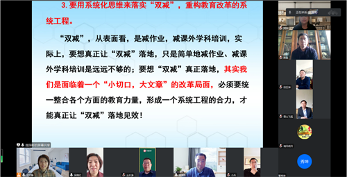 龐院長以前沿教育理論,通過鮮活生動的具體案例為大家深入淺出地解讀國家"雙減"政策,對"雙減"背景下教師面臨的挑戰(zhàn)和機遇進行詳細的分析,為各校如何進行教學改革提供高屋建瓴的指導。通過講座校長們了解到學校要多途徑促進教師全面、正確認識和理解"雙減"的本質內涵;搭建平臺,引領教師切實領會新課標的核心要義;創(chuàng)新機制,鼓勵教師善于進行課堂教學方式的變革與創(chuàng)新;專題研究,正確處理好作業(yè)改革與課堂教學的關系、正確處理好課后服務與課堂教學的關系、正確協(xié)調處理好課后服務與校外教育、家庭教育的關系等。一系列的指導與建議,使大家明確思路,積蓄力量,堅定推進"雙減"背景下對于教學改革的實踐探索。