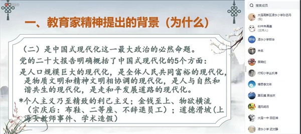 趙教授的精彩報告,讓大家對教育家精神有了更深的感觸。工作室成員在線上展開了熱烈的討論,大家一致表示要全面貫徹兩會重要指示,以教育家精神為導(dǎo)向,立足各校實際辦學(xué)情況,推動特色發(fā)展,培養(yǎng)"四有好老師",當(dāng)好"四個引路人",培育更多有理想、有本領(lǐng)、有擔(dān)當(dāng)?shù)男聲r代好少年。