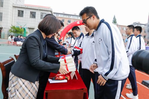 大會第三項,高三學(xué)生向?qū)W校贈禮。書籍連接著高三學(xué)生與母校之間的情感,一本本書籍更是代表著學(xué)子們對母校的深情延續(xù)。