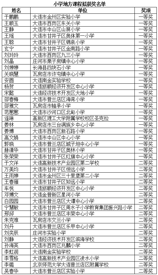 根據(jù)《關(guān)于開展2023--2024年大連市義務(wù)教育地方課程評優(yōu)課工作的通知》要求,經(jīng)各區(qū)遴選與推薦、市級專家評審,2023--2024年度大連市義務(wù)教育地方課程優(yōu)質(zhì)課工作已圓滿結(jié)束,現(xiàn)將擬獲獎(jiǎng)名單予以公示(按姓氏筆畫排序)。