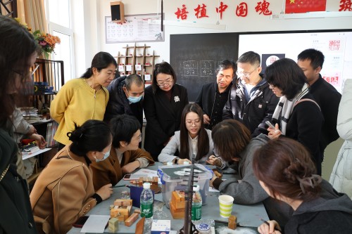 參觀結(jié)束后,沉浸式非遺實(shí)踐環(huán)節(jié)正式啟動(dòng)。在專業(yè)教師的現(xiàn)場指導(dǎo)下,教職工分組體驗(yàn)篆刻、刺繡、衍紙等非遺項(xiàng)目。篆刻工作臺(tái)前,大家屏息凝神,用刻刀在方寸石料上細(xì)細(xì)雕琢“廉”“正”等字;刺繡工作坊內(nèi),大家穿針引線,或繡“蓮”或繡“竹”;衍紙工作臺(tái)前,大家巧妙折疊、精心粘貼,將普通的紙條化作朵朵蓮花。