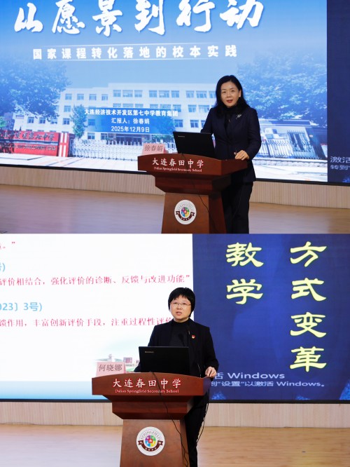 大連春田中學(xué)校長(zhǎng)何曉娜聚焦評(píng)價(jià)改革這一關(guān)鍵環(huán)節(jié),作了題為《牽引·賦能·成長(zhǎng)——指向?qū)W生多維發(fā)展的教學(xué)評(píng)價(jià)探索與實(shí)踐》的分享。報(bào)告系統(tǒng)介紹了學(xué)校如何構(gòu)建以學(xué)生發(fā)展為核心、牽引教學(xué)改進(jìn)、賦能師生成長(zhǎng)的多維評(píng)價(jià)體系,體現(xiàn)了評(píng)價(jià)改革對(duì)育人方式變革的牽引作用。