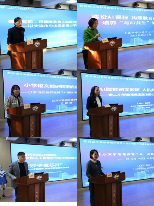 中山區(qū)中心小學校長付欣、東港教育集團校長王艷,從“課程體系構建”“育人場域拓展”角度分享學校數(shù)智化建設頂層設計;西崗區(qū)五四路小學教導處副主任孫開宇、莊河教師進修學校小教部副主任王曉鷗,聚焦一線實踐介紹“教師實踐賦能”“區(qū)域統(tǒng)籌推動”經(jīng)驗;開發(fā)區(qū)松林小學叢曉黎老師、甘井子區(qū)玉濃街小學校長欒迎春,圍繞國家智慧教育平臺應用、數(shù)字教研員機制建設,展示數(shù)智賦能教學成效。