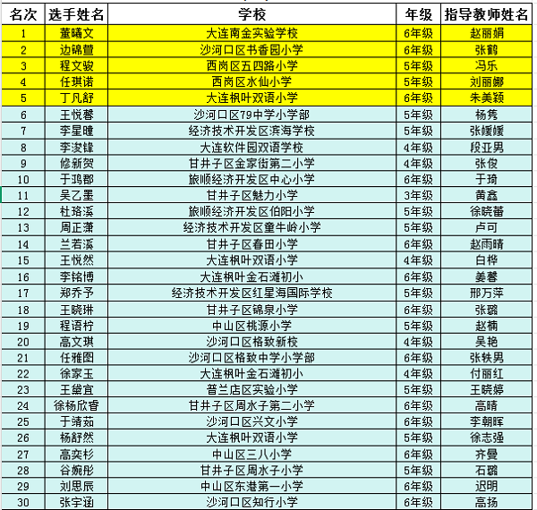 大連市第二十八屆“楓葉杯”演講比賽(小學(xué)、初中、高中組)已經(jīng)圓滿落下帷幕。入圍復(fù)賽的選手獲得“優(yōu)秀獎”。小學(xué)、初中、高中組前五名選手入圍總決賽。現(xiàn)將各組復(fù)賽排名前30名公布如下: