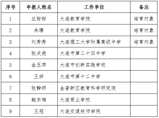 根據(jù)遼寧省教育科學(xué)規(guī)劃領(lǐng)導(dǎo)小組辦公室下發(fā)的《關(guān)于開展遼寧省教育科研中青年骨干推薦申報工作的通知》相關(guān)要求,經(jīng)各區(qū)市縣教育科學(xué)規(guī)劃辦、局屬學(xué)校公開遴選推薦,大連市教育科學(xué)規(guī)劃辦組織專家評審,經(jīng)大連市教育科學(xué)規(guī)劃領(lǐng)導(dǎo)小組同意,現(xiàn)將擬推薦遼寧省中青年科研骨干名單公示如下: