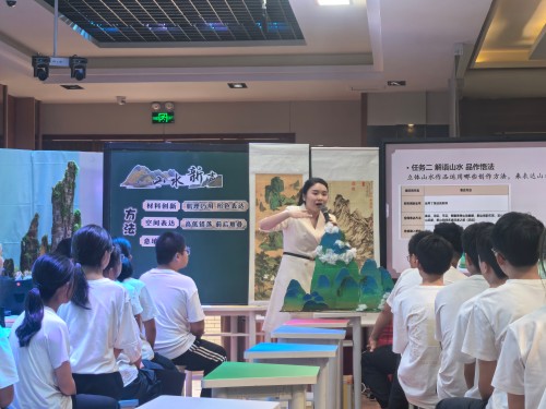 葉曉輝指出,《山水新聲》是團(tuán)隊(duì)單元教學(xué)實(shí)踐的典型案例,思路上通過(guò)“解題、拎線、找法”明晰邏輯;實(shí)踐上推行“多師協(xié)同”,開(kāi)展雙師課堂;指導(dǎo)上聚焦“尋趣探新”,通過(guò)光影山水、AI再創(chuàng)造拓展學(xué)生思路。